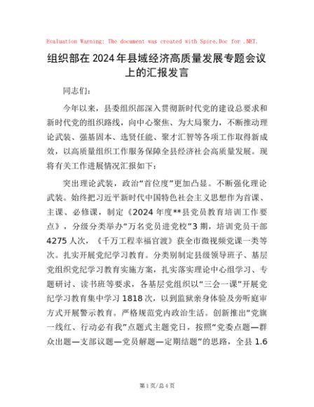 / 组织部在2024年县域经济高质量发展专题会议上的汇报发言