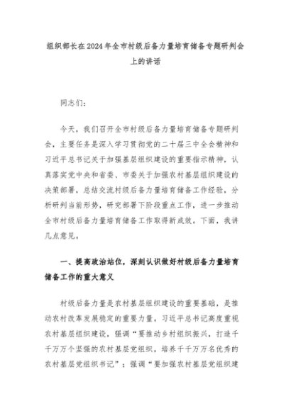 / 组织部长在2024年全市村级后备力量培育储备专题研判会上的讲话