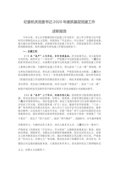 / 纪委机关党委书记2020年度抓基层党建工作述职报告