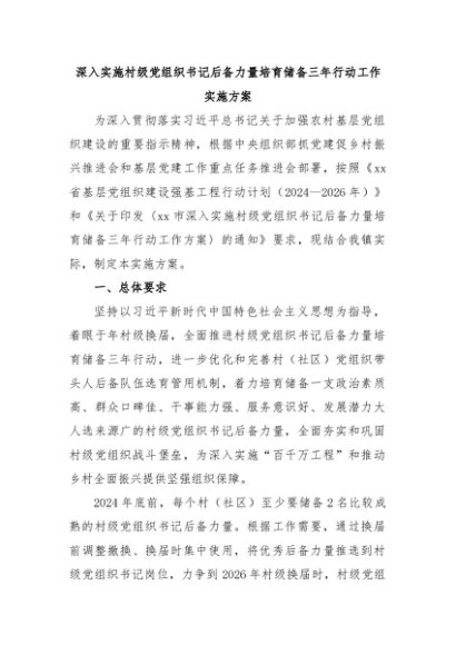 / 深入实施村级党组织书记后备力量培育储备三年行动工作实施方案