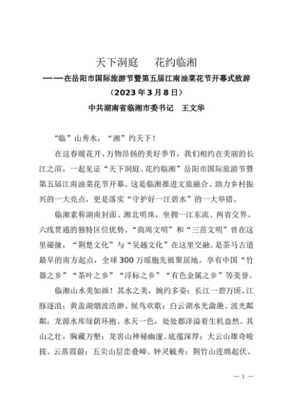 / 王文华:在湖南省岳阳市国际旅游节暨第五届江南油菜花节开幕式致辞(1)