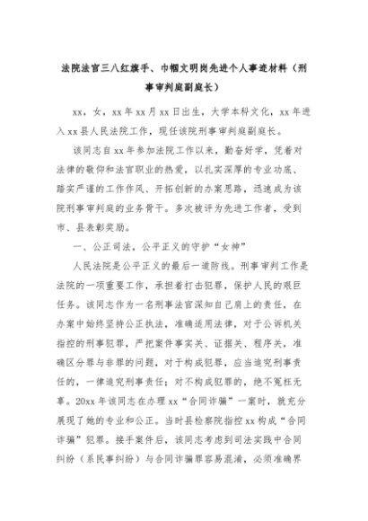 / 法院法官三八红旗手、巾帼文明岗先进个人事迹材料(刑事审判庭副庭长)