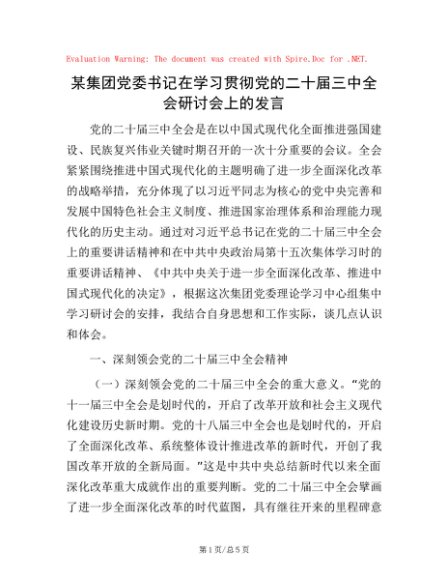 / 某集团党委书记在学习贯彻党的二十届三中全会研讨会上的发言
