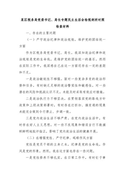 / 某区税务局党委书记、局长专题民主生活会检视剖析对照检查材料