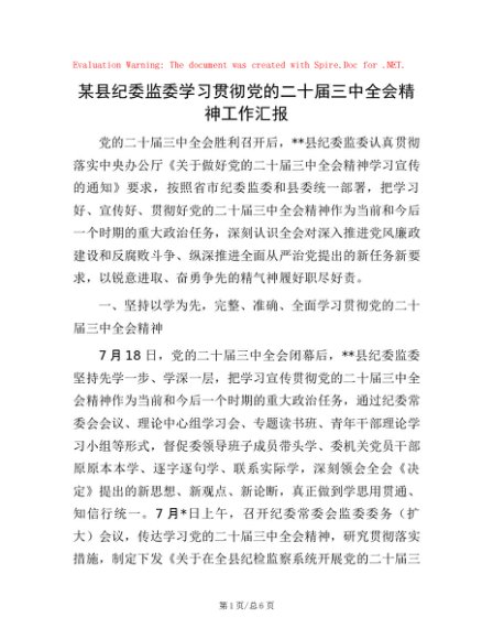 / 某县纪委监委学习贯彻党的二十届三中全会精神工作汇报