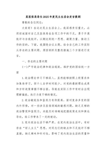 某医保局局长2024年度民主生活会发言提纲(四个带头+典型案例)