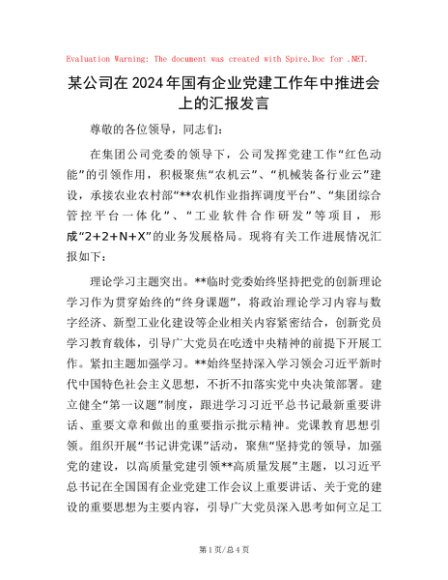 / 某公司在2024年国有企业党建工作年中推进会上的汇报发言
