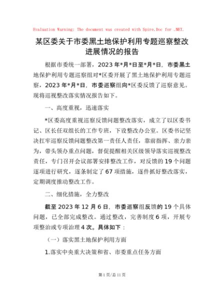 / 某区委关于市委黑土地保护利用专题巡察整改进展情况的报告