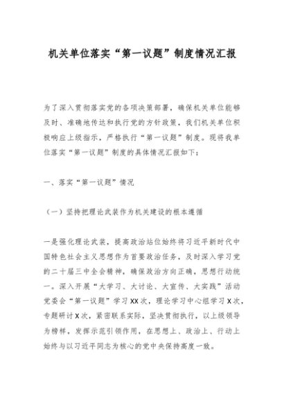 机关单位落实“第一议题”制度情况汇报