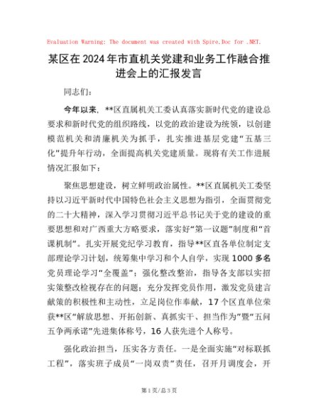 / 某区在2024年市直机关党建和业务工作融合推进会上的汇报发言