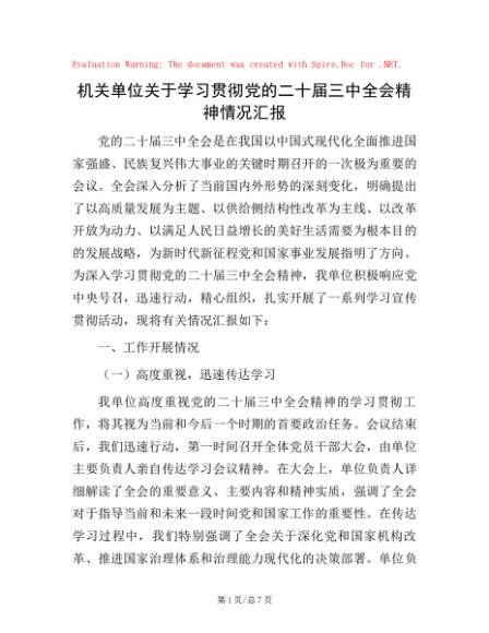 / 机关单位关于学习贯彻党的二十届三中全会精神情况汇报