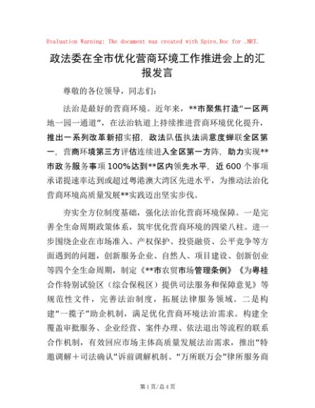 / 政法委在全市优化营商环境工作推进会上的汇报发言