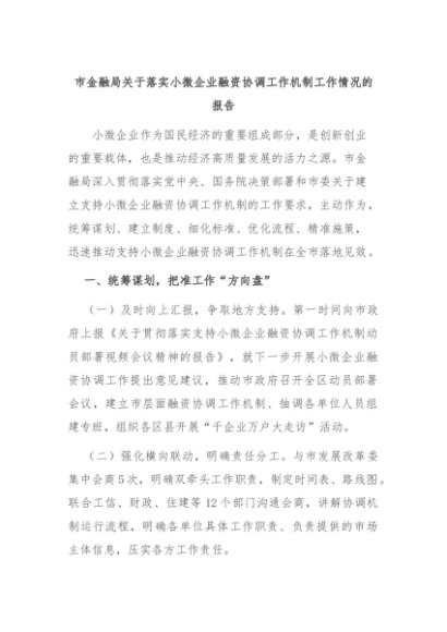 / 市金融局关于落实小微企业融资协调工作机制工作情况的报告