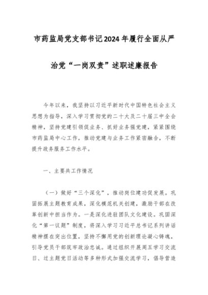 / 市药监局党支部书记2024年履行全面从严治党“一岗双责”述职述廉报告