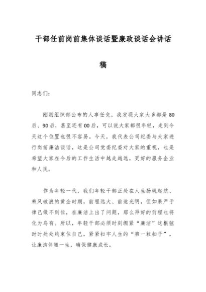 干部任前岗前集体谈话暨廉政谈话会讲话稿