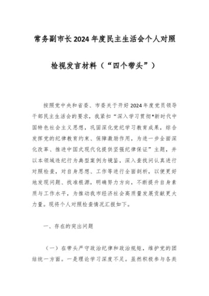 / 常务副市长2024年度民主生活会个人对照检视发言材料(“四个带头”)