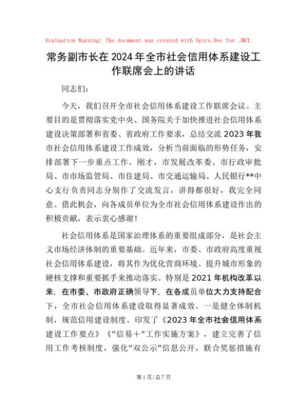 / 常务副市长在2024年全市社会信用体系建设工作联席会上的讲话