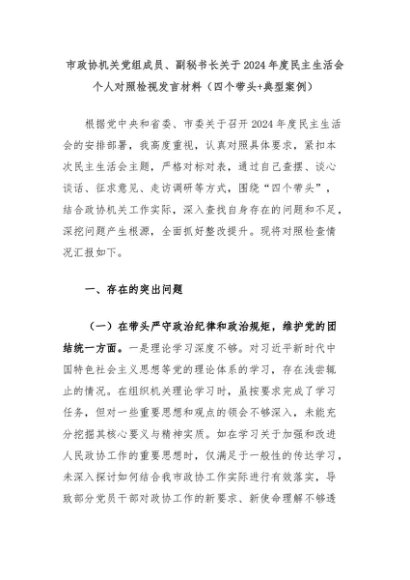 / 市政协机关党组成员、副秘书长关于2024年度民主生活会个人对照检视发言材料(四个带头+典型案例)