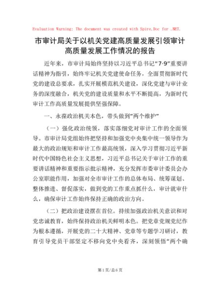 / 市审计局关于以机关党建高质量发展引领审计高质量发展工作情况的报告