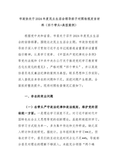 / 市政协关于2024年度民主生活会领导班子对照检视发言材料(四个带头+典型案例)