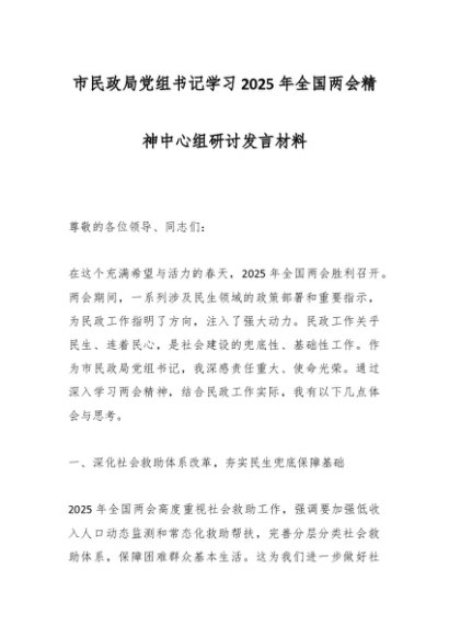 / 市民政局党组书记学习2025年全国两会精神中心组研讨发言材料