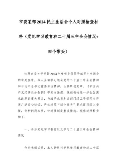 / 市委某部2024民主生活会个人对照检查材料(党纪学习教育和二十届三中全会情况+四个带头)