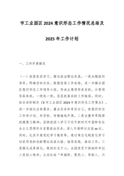 / 市工业园区2024意识形态工作情况总结及2025年工作计划