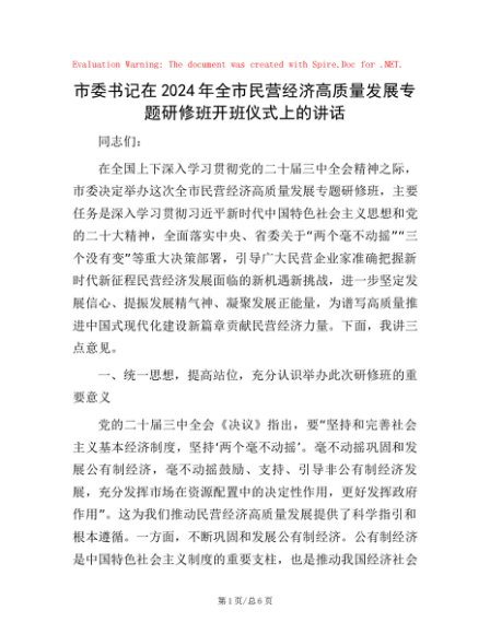 / 市委书记在2024年全市民营经济高质量发展专题研修班开班仪式上的讲话