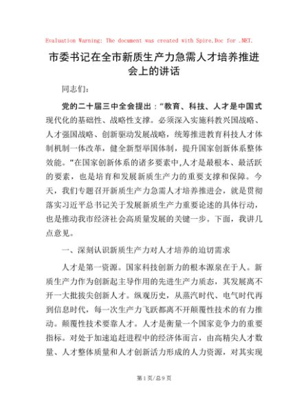 / 市委书记在全市新质生产力急需人才培养推进会上的讲话