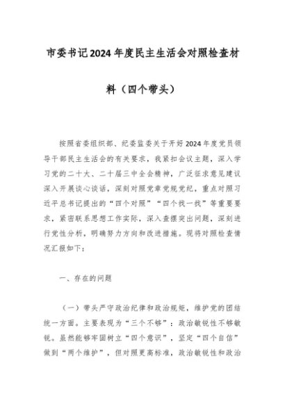 / 市委书记2024年度民主生活会对照检查材料(四个带头)
