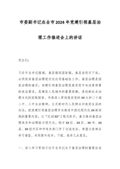 / 市委副书记在全市2024年党建引领基层治理工作推进会上的讲话