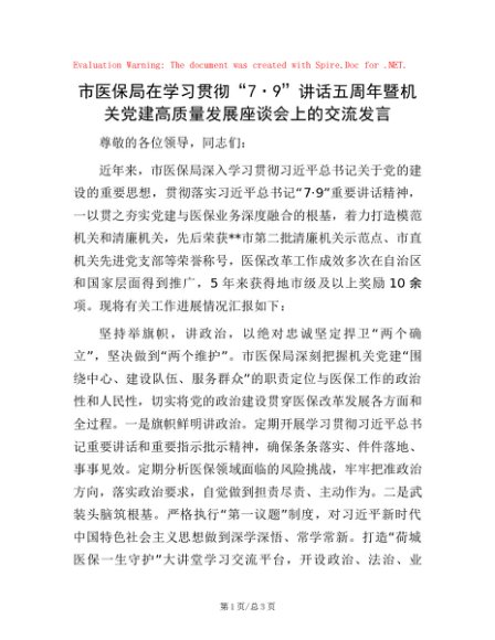 / 市医保局在学习贯彻“7·9”讲话五周年暨机关党建高质量发展座谈会上的交流发言