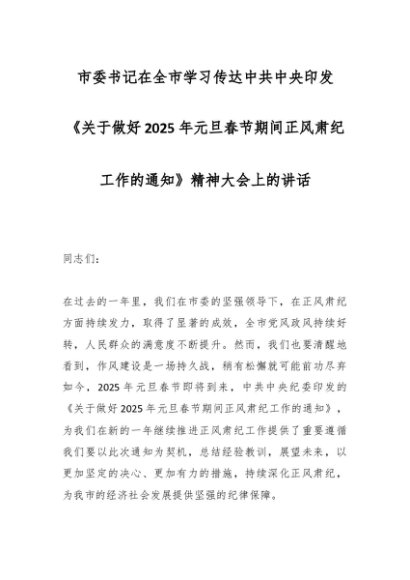 / 市委书记在全市学习传达中共中央印发《关于做好2025年元旦春节期间正风肃纪工作的通知》精神大会上的讲话