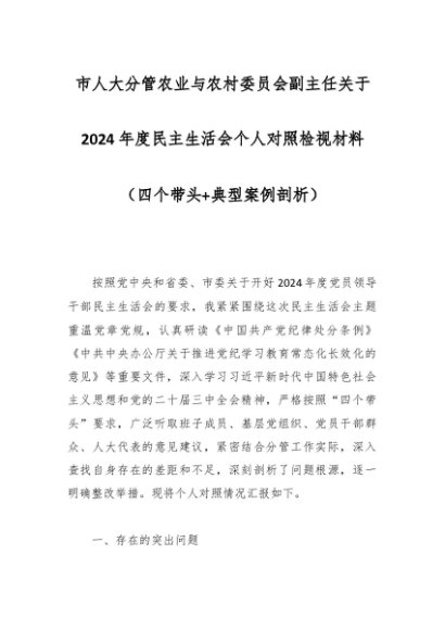 / 市人大分管农业与农村委员会副主任关于2024年度民主生活会个人对照检视材料(四个带头+典型案例剖析)