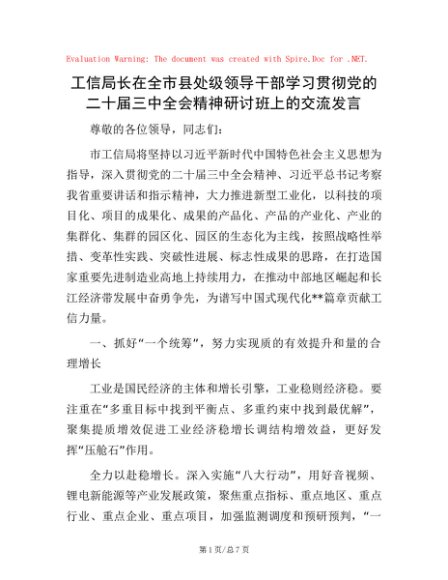 / 工信局长在全市县处级领导干部学习贯彻党的二十届三中全会精神研讨班上的交流发言