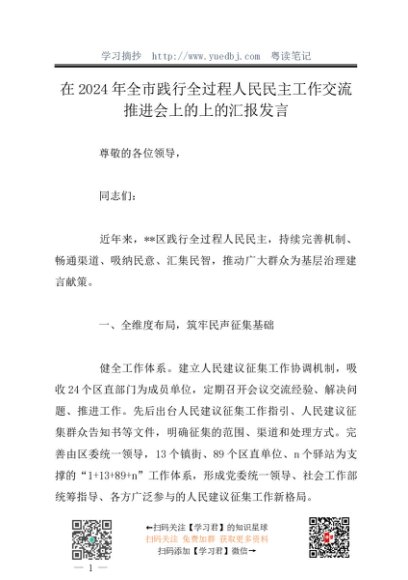 / 工作总结:20241127在2024年全市践行全过程人民民主工作交流推进会上的上的汇报发言
