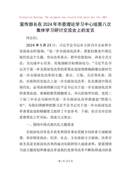 / 宣传部长在2024年市委理论学习中心组第八次集体学习研讨交流会上的发言