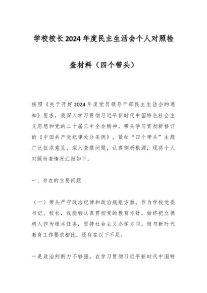 / 学校校长2024年度民主生活会个人对照检查材料(四个带头)