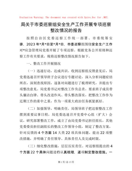 / 局关于市委巡察组安全生产工作开展专项巡察整改情况的报告