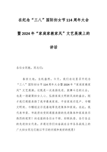 / 在纪念“三八”国际妇女节114周年大会暨2024年“家庭家教家风”文艺展演上的讲话