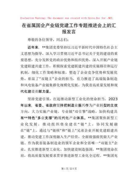 / 在省属国企产业链党建工作专题推进会上的汇报发言