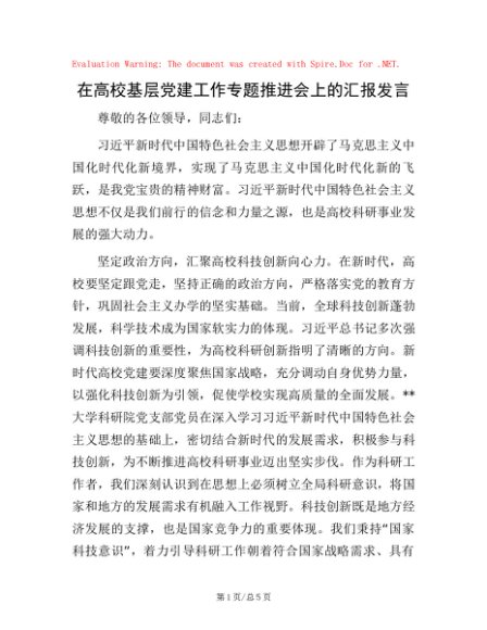 / 在高校基层党建工作专题推进会上的汇报发言