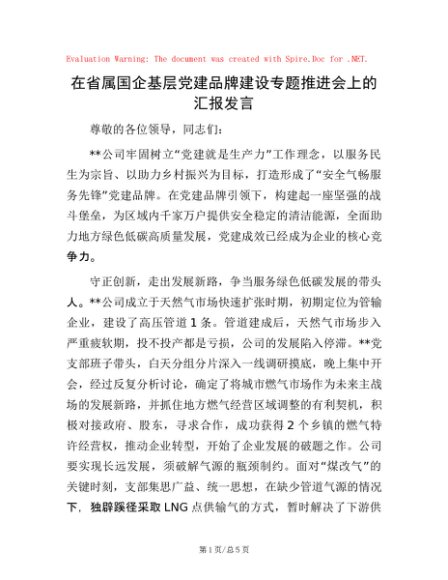 / 在省属国企基层党建品牌建设专题推进会上的汇报发言