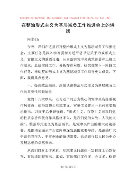 / 在整治形式主义为基层减负工作推进会上的讲话