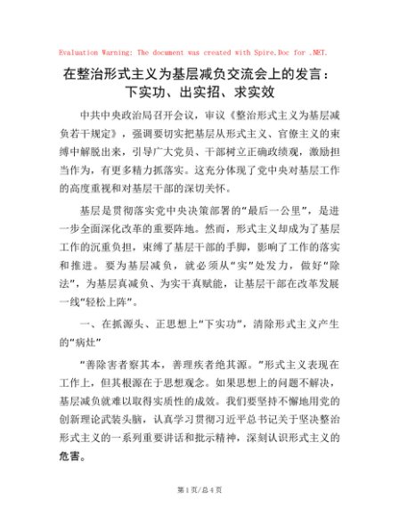 / 在整治形式主义为基层减负交流会上的发言:下实功、出实招、求实效