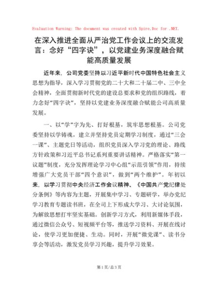 / 在深入推进全面从严治党工作会议上的交流发言:念好“四字诀”,以党建业务深度融合赋能高质量发展