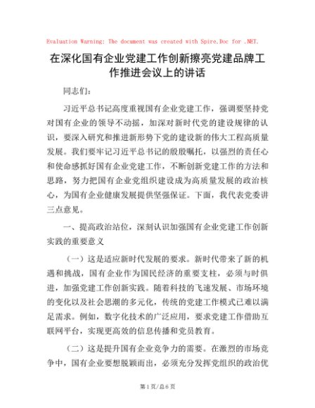 / 在深化国有企业党建工作创新擦亮党建品牌工作推进会议上的讲话