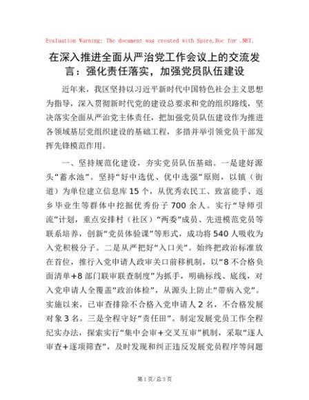 / 在深入推进全面从严治党工作会议上的交流发言:强化责任落实,加强党员队伍建设