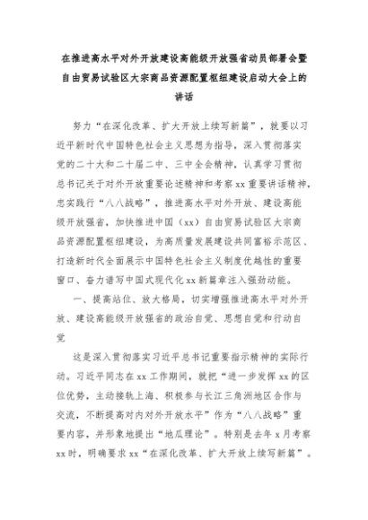 / 在推进高水平对外开放建设高能级开放强省动员部署会暨自由贸易试验区大宗商品资源配置枢纽建设启动大会上的讲话