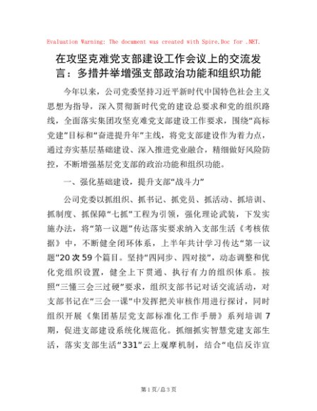 / 在攻坚克难党支部建设工作会议上的交流发言:多措并举增强支部政治功能和组织功能